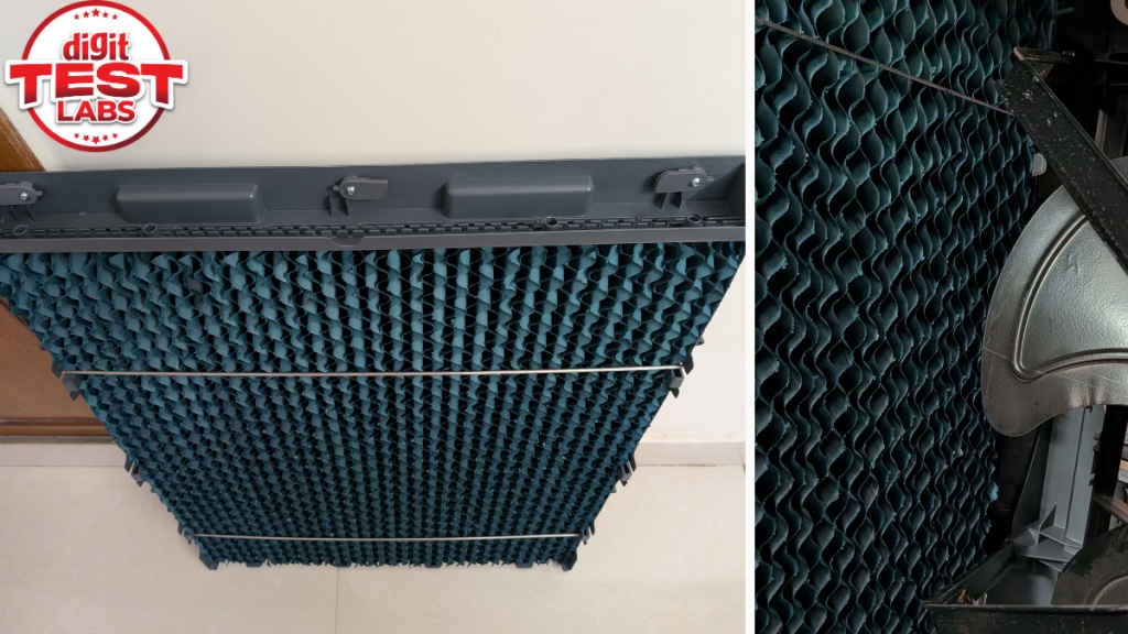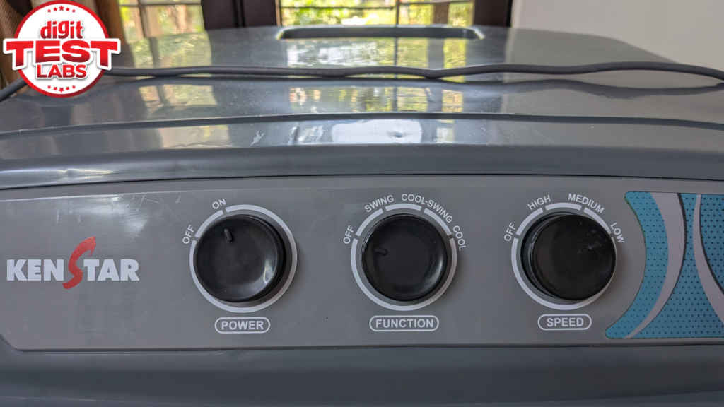 The honeycomb pads are of a turquoise blue shade and blend well with the grey-toned chassis. Rest everything from the 45cm fan, and the vertically movable flaps match the aesthetic. You only have the Maha Kool 90 branding, 5-star BEE rating sticker and the Kenstar logo around the three rotary knobs. These knobs situated on its forehead are for: Power (On/Off), Function (Swing, Cool-Swing, Cool, Off) and Speed (High, Medium, Low, Off), respectively. Nothing fancy. They just work reliably. No remote included, and honestly, I don’t feel the need.