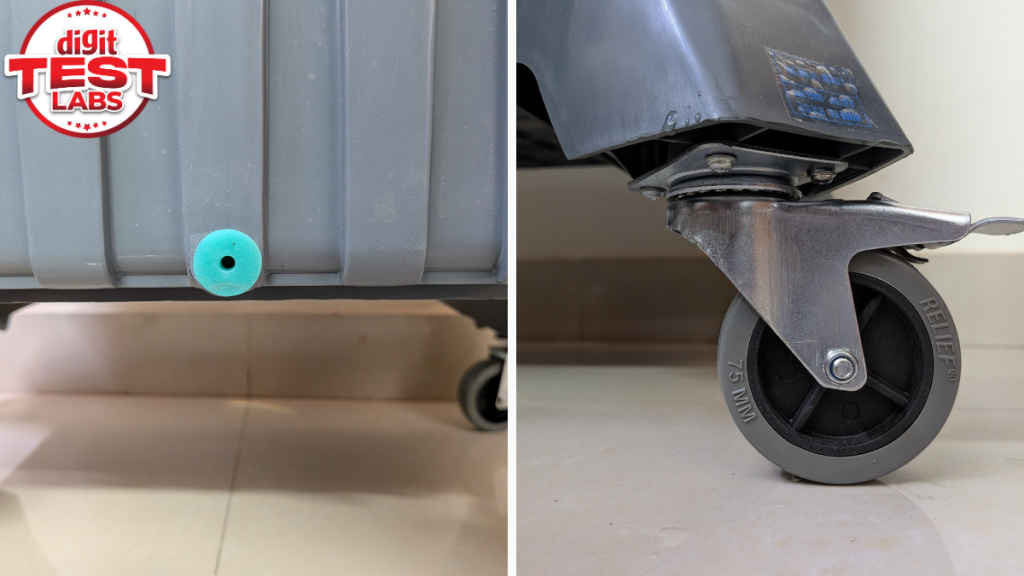 But, overall, the Kenstar cooler’s build quality is solid. As mentioned already, the wheels can handle the weight of the filled cooler well. A lean guy like me could also move it around with a tinge of effort. Still, while moving it around, be careful of its stature. You don’t want to hit and damage the corners of your wall or anything. In any case, if its placement is decided, you shall push down the wheel brake/lock/stopper. The stopper is metallic with angular edges, and you don’t want to accidentally scrape your leg on it.