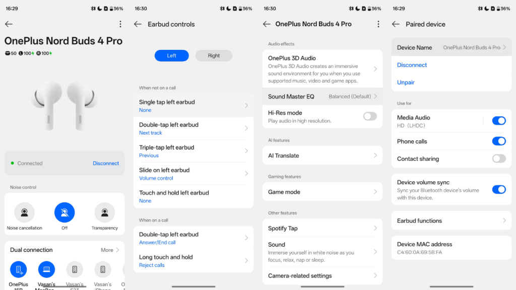 The OnePlus Nord Buds 4 Pro carry audio via Bluetooth 6.0, and the connection has been stable. You can easily pair them with Google Fast Pair, and I had no difficulty pairing them with an iPhone and a MacBook Air. Thanks to dual-device connectivity, you can listen to two devices at the same time, and this worked reliably between my Android phone and MacBook.