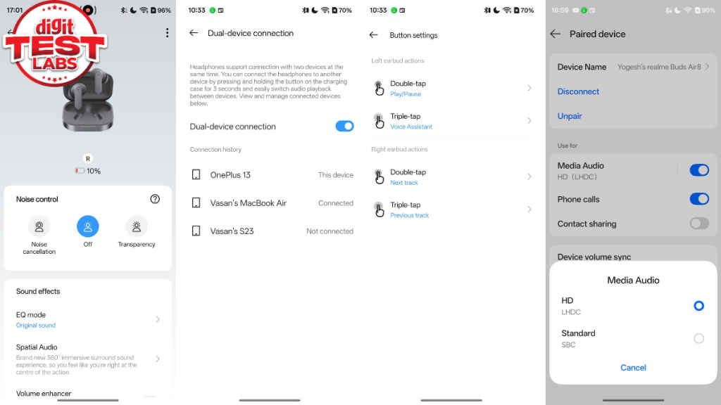 Speaking of which, the Realme Link app also offers options to control ANC levels, enable transparency mode, activate low-latency Game Mode, customise touch controls, adjust EQ, enable auto-play/pause, enable Spatial Audio and high-definition LHDC 5.0 codec. In case of touch controls, I wish Realme had given the option to assign function(s) to a single tap also.