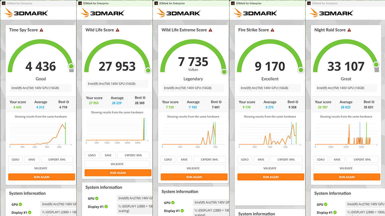 Integrated graphics is one of the most quietly important parts of the PA14250’s performance profile. Business laptops have historically treated iGPUs as display engines first and performance devices second. The Arc 140V results here suggest something different: a capable integrated GPU that can meaningfully contribute to creative workloads, GPU-accelerated productivity features, and casual gaming.