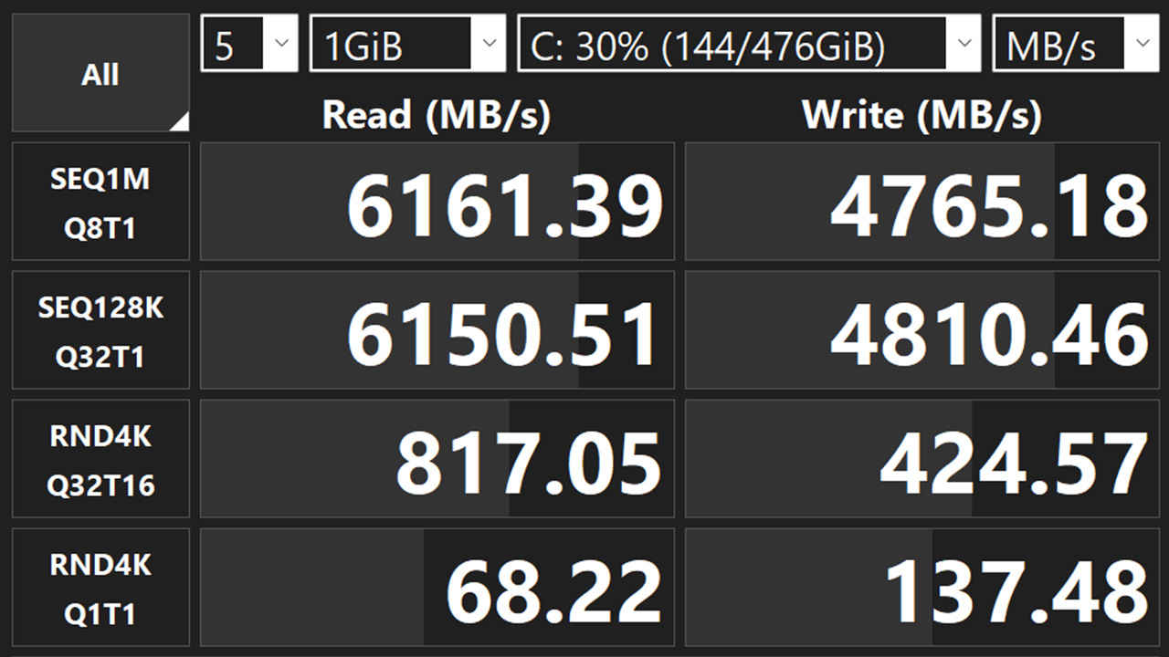 The Samsung PM9C1a 512GB SSD delivers the kind of performance expected from a modern premium laptop. CrystalDiskMark results in about 6161 MB/s for read speeds and similar write speeds. The sequential numbers are strong and will benefit large file transfers, application installs, and workloads involving big media assets. The random numbers, particularly the 4K Q1T1 results, are important for everyday responsiveness: boot behaviour, app launching, and the countless small file operations that happen under the hood in Windows. The results here are healthy, and they should translate to a laptop that feels quick and consistent in daily use.