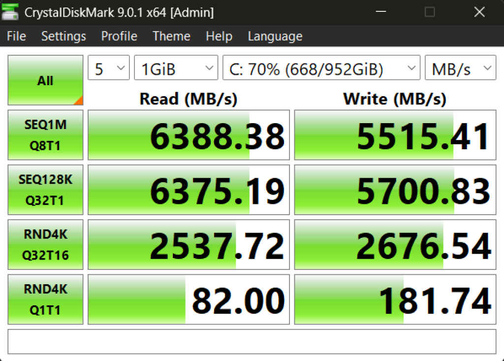 - SSD: The 1TB Gen 4 SSD is equally impressive, hitting sequential read speeds of 6,388 MB/s and write speeds of 5,515 MB/s. Game load times are practically non-existent; I was often the first one to load into the map in multiplayer matches.