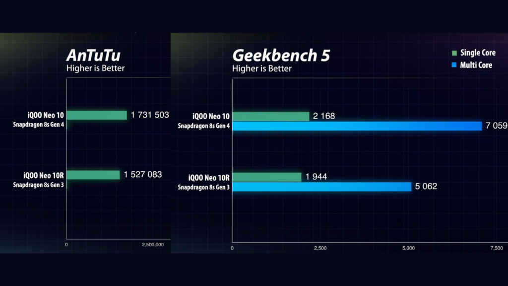 In our benchmarks, the iQOO Neo 10 scored over 1.7 million on AnTuTu. It comfortably places itself in flagship territory and ahead of most phones in its segment as well. Even on Geekbench, the scores were pretty solid. But here’s the interesting part: the iQOO Neo 10R, its cheaper sibling (Rs 26,999), is not far behind. On AnTuTu, it’s only about two lakh points lower, and Geekbench scores were also within a tight margin.