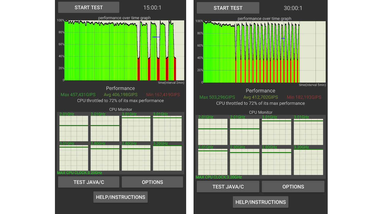 We also ran a stress test: 15 minutes under normal load and 30 minutes under heavy load, and here’s where things got a bit unpredictable. While the phone started strong, we noticed a zig-zag performance pattern after a point. Sudden dips, quick recoveries, and then dips again. It wasn’t gradual throttling; it was erratic, and that’s something gamers will definitely feel, especially in competitive scenarios.