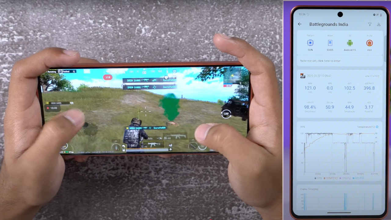 That said, the overall gaming experience on the Neo 10 is smooth. In our tests, it ran BGMI at over 98% stability. We recorded an average of 102 FPS and a peak of 121 FPS. So yes, gaming is a treat. No major thermal throttling either.