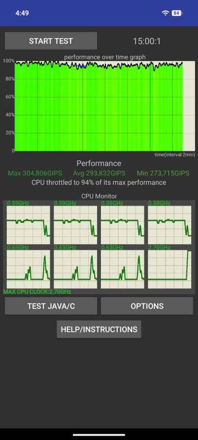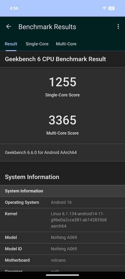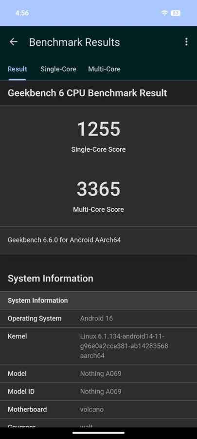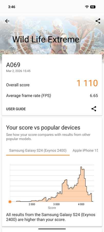In Antutu, the Phone 4a achieved a score of about 1.02 million. In Geekbench, it recorded 1,255 in single-core and 3,365 in multi-core score. In the 3DMark Wildlife Extreme test, the Phone 4a scored 1,110, while the CPU throttling test showed stability of 94%.