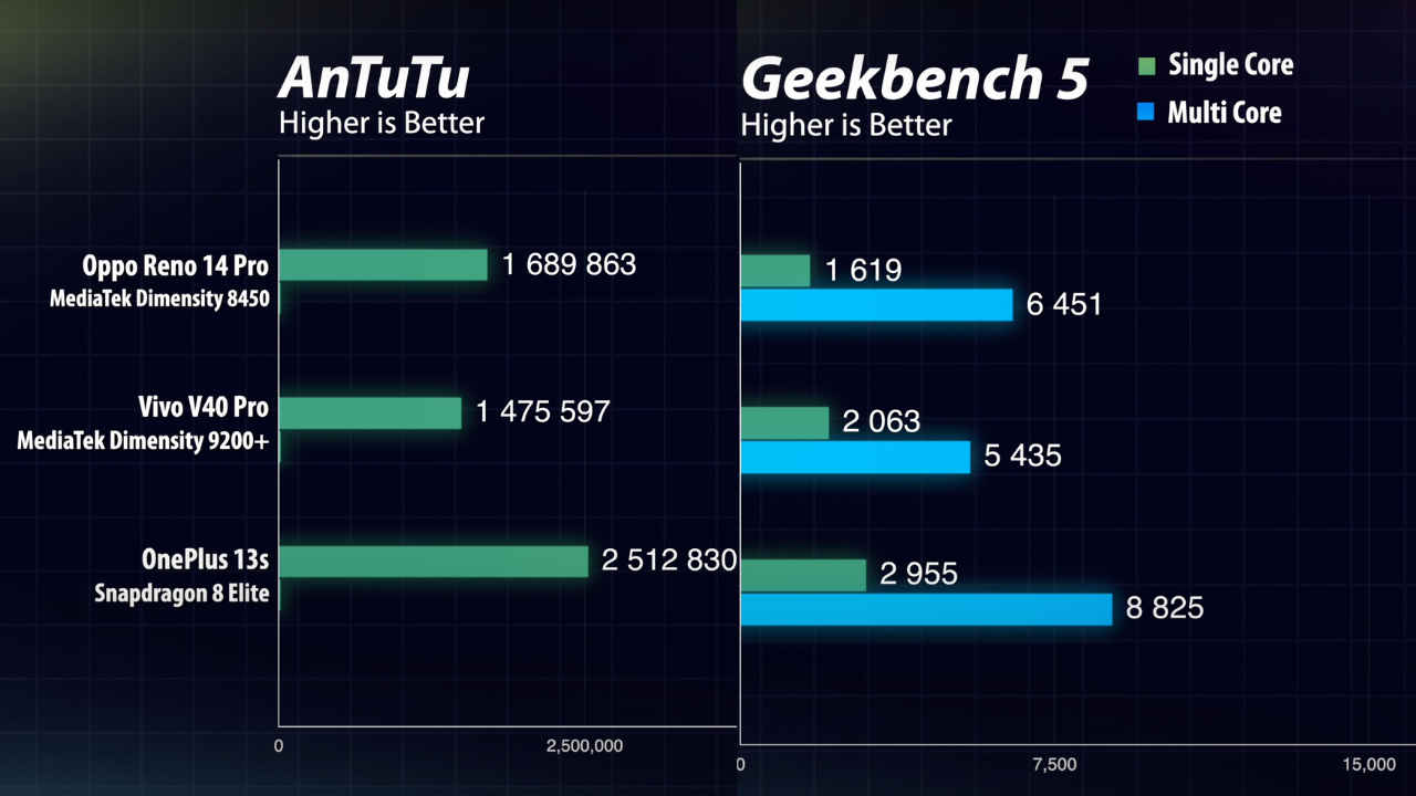 The Oppo Reno 14 Pro is powered by the MediaTek Dimensity 8450 chipset, which is paired with two storage variants – 12GB RAM + 256GB storage and 12GB RAM + 512GB storage. On the AnTuTu test, it scored close to 1.7 million points. With this number, it easily beat its close competitor, the Vivo V40 Pro, but was left far behind the OnePlus 13s. Now I talked about the OnePlus 13s because people can consider this phone the most at this price segment. Yes, it is Rs 5000 pricier than the Reno 14 Pro, but there’s a big margin in performance number between these two. On the Geekbench test, the Reno 14 Pro managed a score of 1619 on the single-core test and 6451 on the multi-core test.