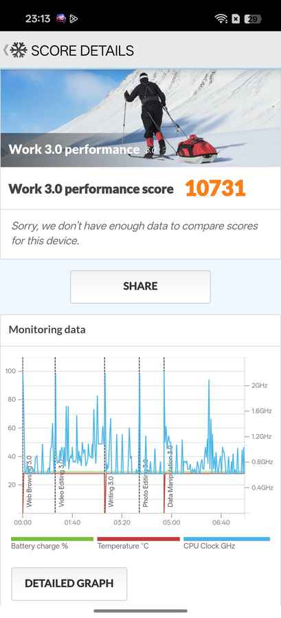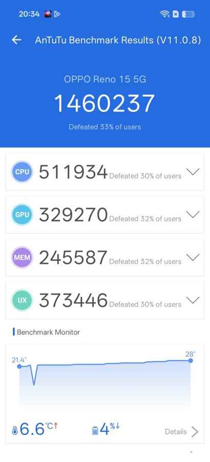 On the PCMark Battery Life test, the Reno 15 lasted 21 hours and 30 minutes, which comfortably puts it in the territory of a day and a half of use for most people. During regular usage, mixing photography, social media scrolling, light image editing, gaming and navigation, the phone rarely induced battery anxiety. Even with moderate to slightly heavy use, it’s realistic to end the day with plenty of charge left.