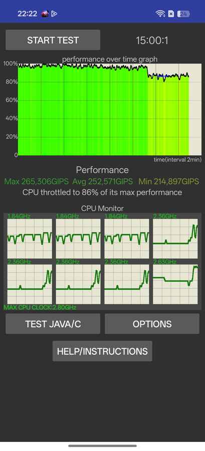 In everyday use, the Reno 15 largely behaves like a modern upper midrange phone. General tasks like app switching, web browsing, social media, navigation and image editing run smoothly, with no obvious stutters or slowdowns. Gaming performance is equally predictable rather than headline-grabbing. Titles like BGMI run lag-free at up to 90fps on low settings, and thermal management remains under control, but not during extended sessions. In CPU throttling tests, the phone maintains around 86% of its peak performance, which is an excellent and stable sustained output without aggressive thermal drop-offs.