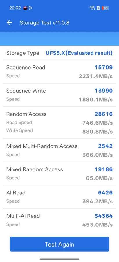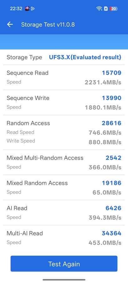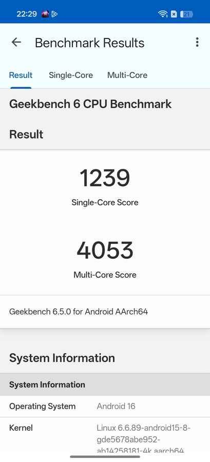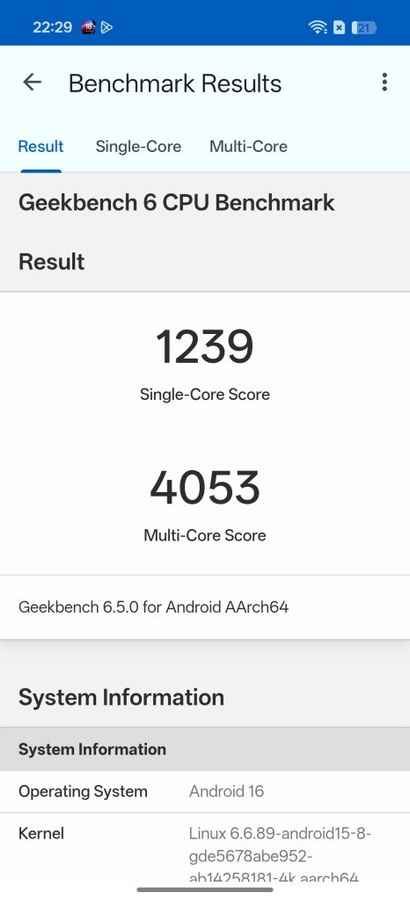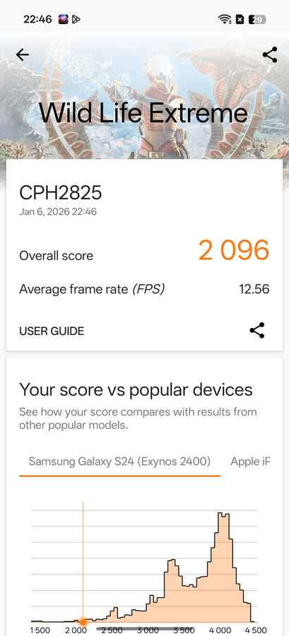 But benchmark results place the Reno 15 squarely in familiar territory. It scores 1,239 in Geekbench 6’s single-core test and 4,053 in the multi-core run, while Antutu returns a combined score of 1,460,237. In GPU-focused workloads, the device records 2,096 in 3D Mark Wildlife Extreme and 10,731 in the Work 3.0 test.