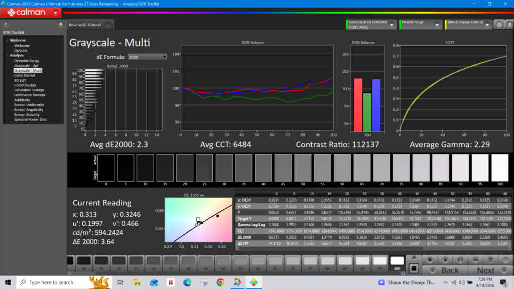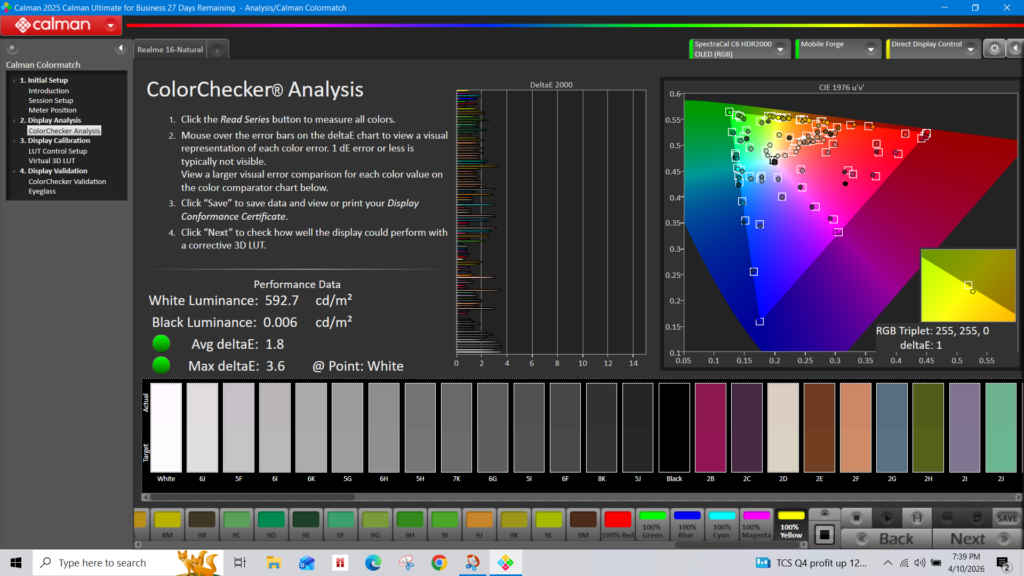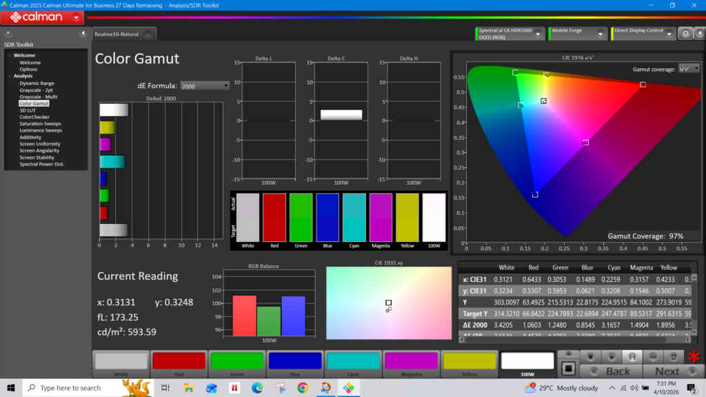 I also tested the display using Calman, and the results are quite reassuring. Colours appear accurate and balanced in the Natural mode, which is also the most calibrated mode available in the device. The average DeltaE came out to 1.8, and the maximum DeltaE was 3.6. Whites look clean, Blacks are deep, and the contrast is strong. The measured white luminance was around 592 cd/m², while black luminance stayed close to zero, which helps with that punchy look.