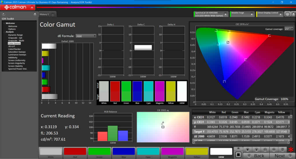 We also ran the Calman test using the SpectraCal C6 colorimeter and the results easily back up the claims I made above. Colours were accurate, whites are natural and blacks are deep. For most users, this means photos look true to life and videos look exactly as the creator intended. Speaking of the numbers, Average DeltaE 2000 was 2, Max DeltaE was 4.8, Gamut Coverage: 100% sRGB, Peak Brightness was 707 cd/m² (measured) and Black Luminance was 0 cd/m².