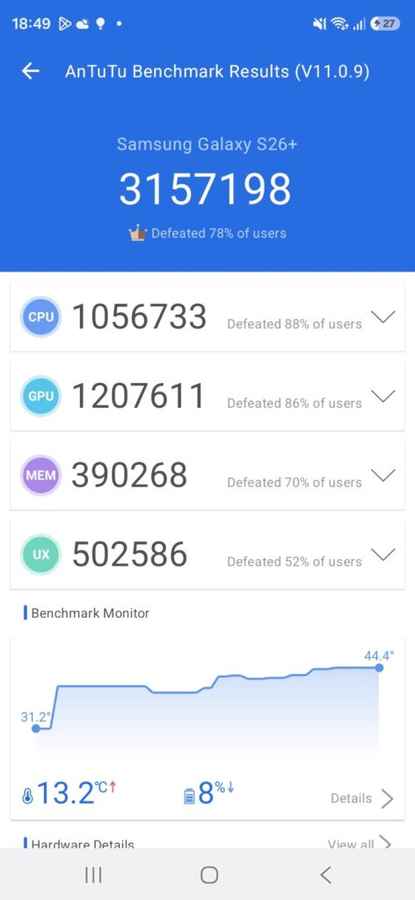 The Galaxy S26 Plus also posted steady numbers in a range of benchmarks. In Antutu, the device scored 31,57,198, along with 2,777 in Geekbench single-core and 9,718 in multi-core tests. In GPU-heavy workloads, it managed 6,810 in 3DMark Wildlife Extreme, while PCMark Work 3.0 returned a score of 20,367. Again, these are solid numbers, keeping it competitive within this price bracket.