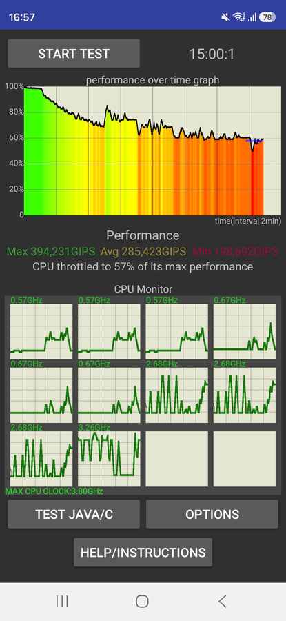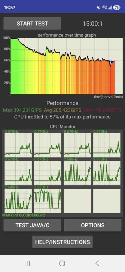 Now, in terms of managing the thermals, it does a pretty good job most of the time for most tasks. You see, while playing games on the Galaxy S26 for extended periods, the phone tends to warm up. For instance, after around 30 minutes of gaming, you can feel the rise in temperature on the back. And this is something that also showed up in the CPU throttling test, where the phone scored a 57 per cent stability. This suggests that, while the phone is capable of handling the load, it does so at the cost of performance consistency to keep the heat in check.