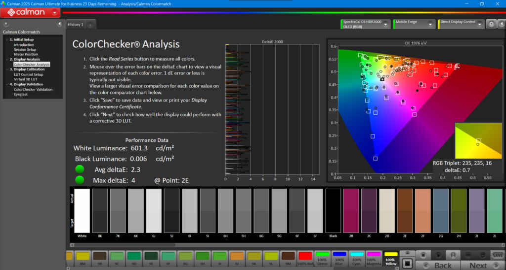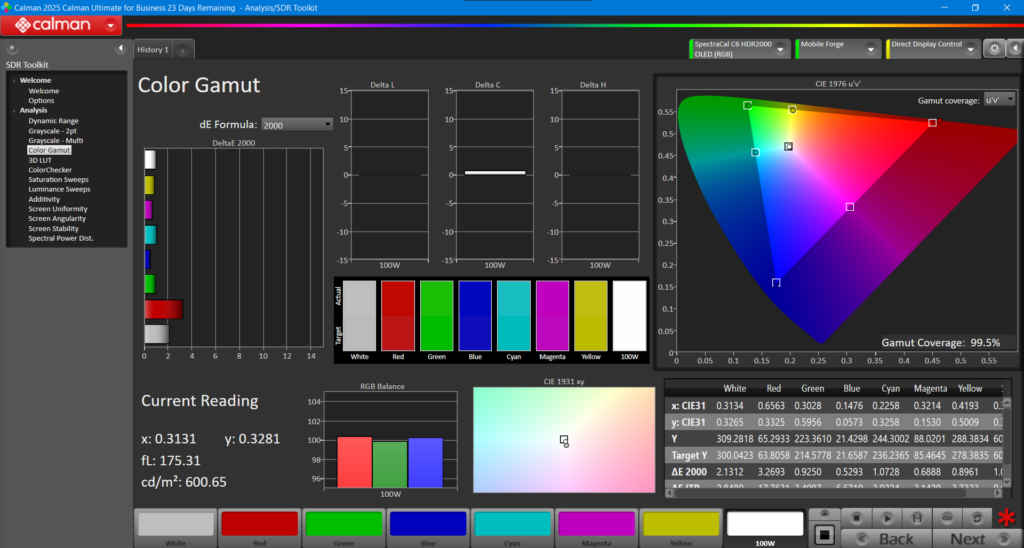 In the Calman colour test, I put the display on the ‘Professional mode’, and it got an average delta E of 2.3, which is okay. In the Colour Gamut test, it measured 99.5%.