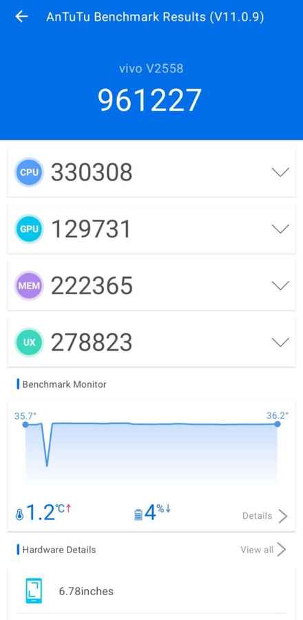 For those interested in benchmarks, the V70 FE does fall behind some competitors in its price range. It scored 9,61,227 on Antutu, along with 976 in Geekbench’s single-core test and 2,953 in the multi-core test. For context, the OnePlus Nord 6 (review), which was recently launched in a similar price bracket, achieved really high scores, with 24,35,837 on Antutu, 2,087 in Geekbench single-core, and 6,689 in multi-core tests.