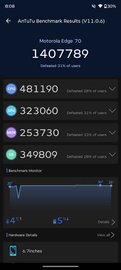 Benchmark results back up this real-world performance. The Edge 70 scored about 1.4 million on Antutu. In Geekbench 6, the phone recorded 1,334 in single-core and 4,248 in multi-core performance. CPU throttling stability stands at 88%, while the device scores 7,633 on 3DMark Stress Test. These are respectable numbers for a phone in this segment and align well with how the phone performs in daily use.