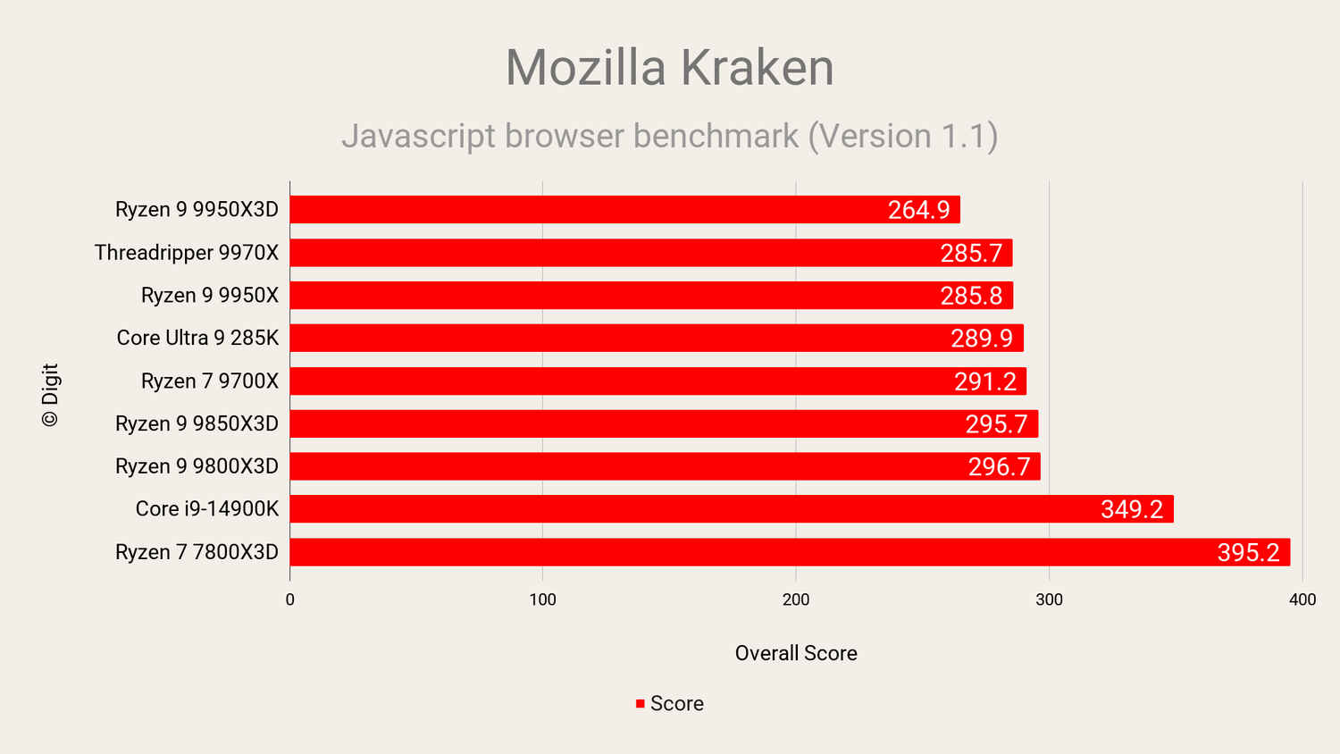 Mozilla Kraken and Google Octane are JavaScript benchmarks evaluating a processor’s performance in executing complex web-based scripts, reflecting real-world web application usage. It tests single-threaded performance and the efficiency of a CPU’s instruction pipelines in handling dynamic scripting languages. With a higher top-end boost, the 9850X3D is positioned to edge ahead here, though the difference is rarely night-and-day in real browsing.