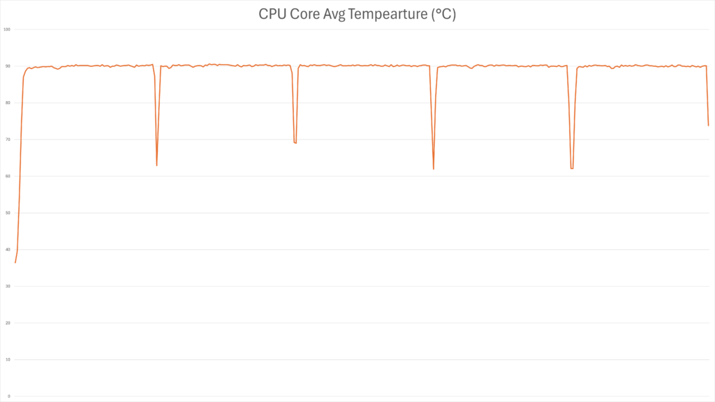 For such a cache-heavy, high-power desktop CPU, the Ryzen 9 9950X3D2 appears surprisingly well-behaved in this configuration. The recorded average CPU package temperature of 36 degrees Celsius suggests that the NZXT 360 mm cooler is doing its job comfortably under sustained mixed load conditions. Even the peak temperature of 90 degrees Celsius remains well within AMD’s specified thermal ceiling of 95 degrees Celsius, leaving some headroom rather than pushing the silicon to the brink.