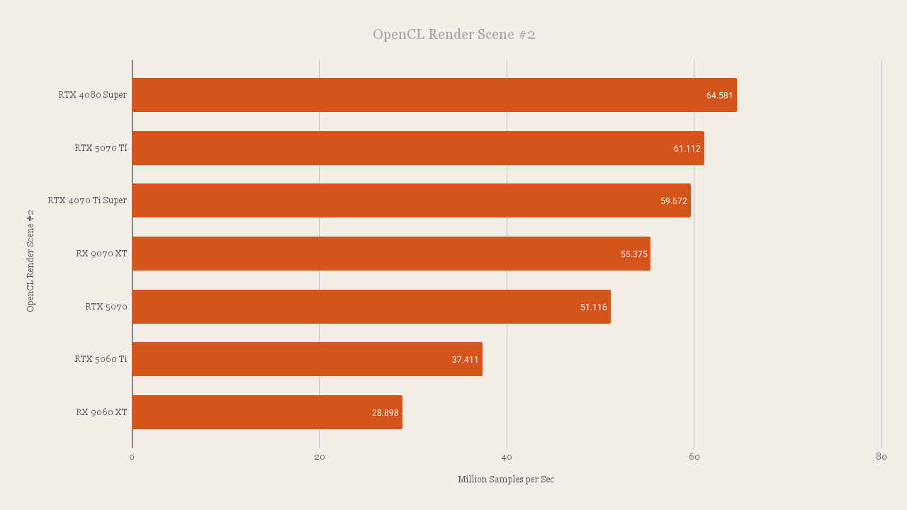 This benchmark utilises OpenCL to generate photorealistic results by strictly adhering to the physics of light, a process known as physically-based rendering. Rendering progress is gauged by the number of samples calculated, which can be visualised as “light particles” that have interacted with the scene and reached the camera’s sensor. As a physically-based renderer, the results closely reflect how GPUs are used in industrial rendering applications.