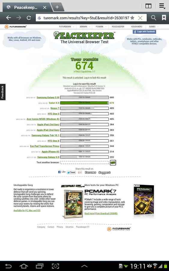 The Galaxy Note 800 is powered by a 7000 mAh battery. We ran a 720p HD MP4 video on loop with full brightness and full volume and the device lasted us for nearly six hours, which is very good. We expect it to last roughly 8-10 hours with intensive usage. With moderate daytime usage, the device lasted us two days, with about 25 percent life left. In that time, we’d played some ShadowGun, run a few benchmarks and video clips, done some browsing, along with some social networking.