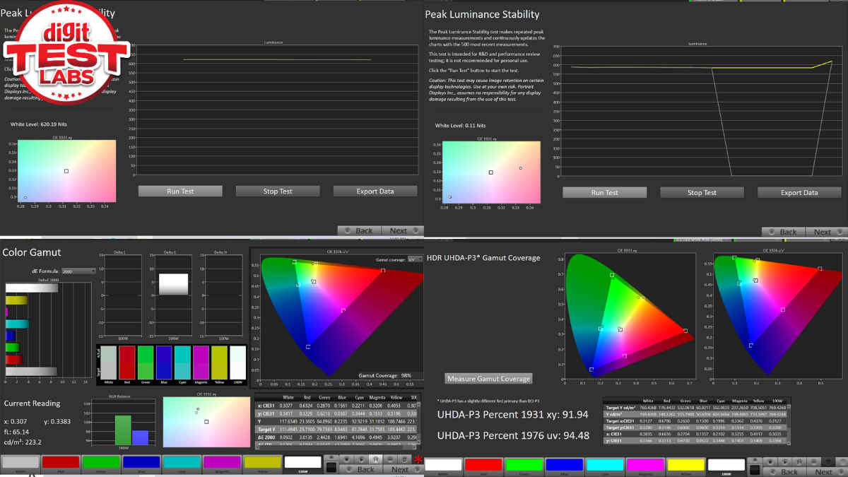 For comparison, the Lumio Vision 9 (review) posts stronger raw numbers in several areas. It measured 903 nits peak brightness at 25%, significantly brighter than the Hisense. Colour coverage is also wider, with 98.04% UHDA-P3, 82.12% BT.2020, and 100% BT.709, alongside an excellent average Delta E of 1. On paper, the Lumio clearly leads in colour accuracy and peak luminance.