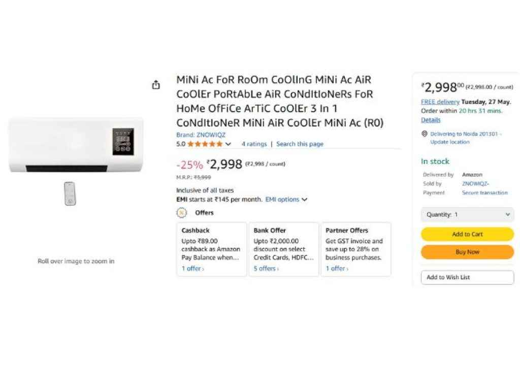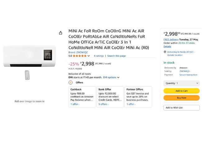 MiNi Ac ரூ,2,998க்கு லிஸ்ட்டிங் செய்யப்பட்டுள்ளது மேலும் இது பார்க்க உண்மையான AC போலவே இருக்கிறது மேலும் நீங்கள் இதில் பேங்க் ஆபர் நன்மையுடன் amazon pay ICICI கிரெடிட் கார்ட் மூலம் வாங்கினால் கேஷ்பேக் நன்மை போன்று பல வழங்கப்படுகிறது மேலும் இந்த ac யில் டிஜிட்டல் கண்ட்ரோல் LED டிஸ்ப்ளே மற்றும் ரிமோட்டும் இருக்கிறது மேலும் இதில் பல சுவாரஸ்ய அம்சங்கள் கொண்டுள்ளது.