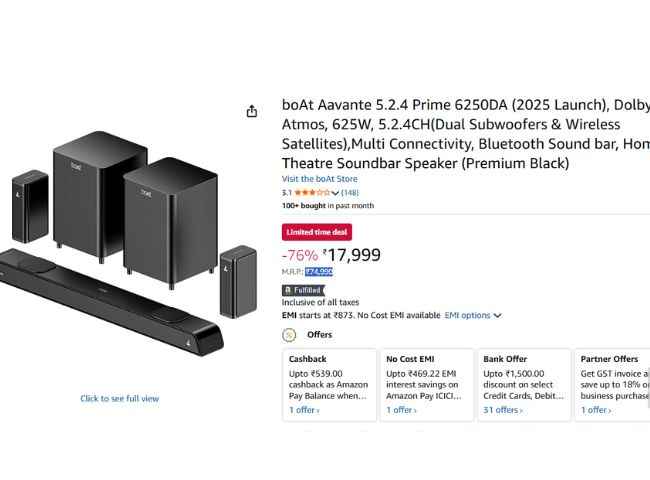 boAt யின் சவுண்ட்பார் அமேசானில் ரூ,17,999க்கு லிஸ்ட்டிங் செய்யப்பட்டுள்ளது ஆனால் பேங்க் ஆபரின் கீழ் ரூ,1500 டிஸ்கவுண்ட் வழங்கப்படுகிறது அதன் பிறகு இதை 16,499ரூபாய்க்கு வாங்கலாம் இதை தவிர நோ கோஸ்ட் EMI மற்றும் Amazon pay பேலன்ஸ் போன்ற பலர் நன்மையை பெறலாம் boAt Aavante 5.2.4 Prime 6250DA ரூ,30,999க்கு அறிமுகம் செய்யப்பட்டது ஆனால் இதன் MRP விலை ரூ,74,990 ஆகும் ஆனால் இதில் மிக சிறந்த டிஸ்கவுண்டின் கீழ் குறைந்த விலையில் வாங்கலாம். .