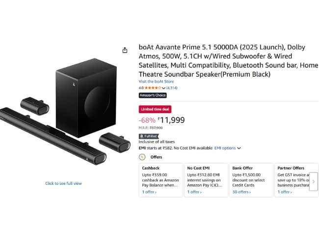 boAt யின் இந்த சவுண்ட்பார் அமேசானில் ரூ,11,999க்கு லிஸ்ட்டிங் செய்யப்பட்டுள்ளது ஆனால் இப்பொழுது நீங்கள் பேங்க் ஆபரின் கீழ் ரூ,1500 டிஸ்கவுண்ட் வழங்கப்படுகிறது அதன் பிறகு இதை வெறும் ரூ,10,499க்கு வாங்கலாம் மேலும் நோ கோஸ்ட் EMI மற்றும் Amazon கேஷ்பேக் போன்ற பல நன்மையை பெறலாம் இதை தவிர இந்த சவுண்ட்பார் ரூ,37,990க்கு அறிமுகம் செய்யப்பட்டது ஆனால் இப்பொழுது அதன் அறிமுக விலையிலிருந்து சவுண்ட்பரில் அதிரடியாக ரூ,27,491 டிஸ்கவுண்ட் பெறலாம்.