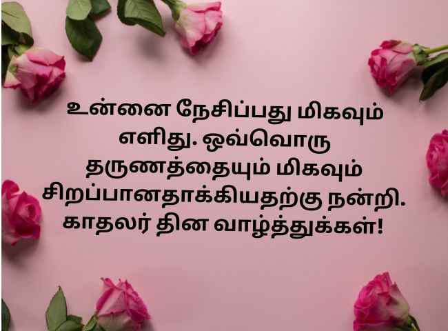 • உன்னை நேசிப்பது மிகவும் எளிது. ஒவ்வொரு தருணத்தையும் மிகவும் சிறப்பானதாக்கியதற்கு நன்றி. காதலர் தின வாழ்த்துக்கள்!தலர் தின வாழ்த்துக்கள்!