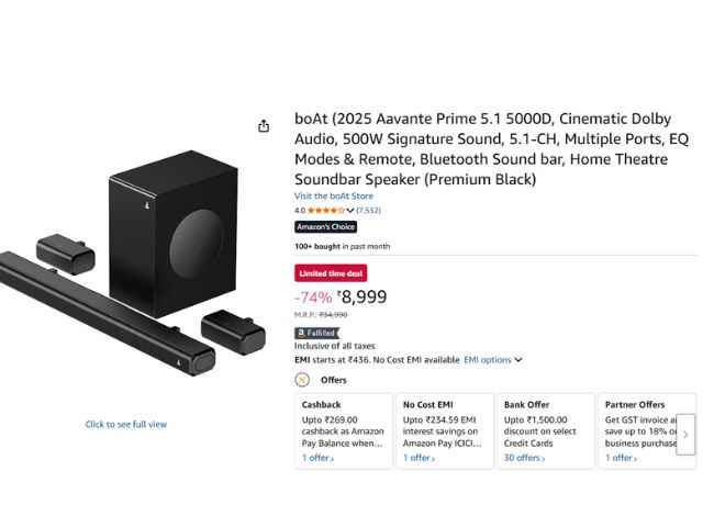 இந்த Boat 5.1 5000D ஹோம் தியேட்டர் சினிமாடிக் டால்பி ஆடியோ பர்போமன்சை வழங்குகிறது. 5.1 ஹோம் தியேட்டராக, இது வயர்டு சப் வூஃபர் மூலம் அதன் சவுண்ட்பாரிலிருந்து உருவாக்கப்பட்ட 500W ஒலி வெளியீட்டையும், இரண்டு வயர்டு ரியர் ஸ்பீக்கர்களையும் கொண்டுள்ளது. மல்டி-சேனல் இணைப்பு விருப்பங்களால் ஆதரிக்கப்படும் இந்த ஹோம் தியேட்டரில் AUX, USB, ஆப்டிகல், HDMI eARC, அத்துடன் தொந்தரவு இல்லாத வயர்லெஸ் சாதன ஒருங்கிணைப்புக்காக புளூடூத் v5.3 ஆகியவை அடங்கும். பயன்படுத்த மற்றும் கட்டுப்படுத்த எளிதானது, இது ம்யூசிக், திரைப்படம் மற்றும் செய்திகள் போன்ற பல-ஈக்யூ மொட்களைகளை வழங்குகிறது, இதனால் ஆடியோ உள்ளடக்கத்திற்கு ஏற்ப அப்டேட் செய்கிறது , இதை அமேசானில் ரூ,7,499 யில் வாங்கலாம்