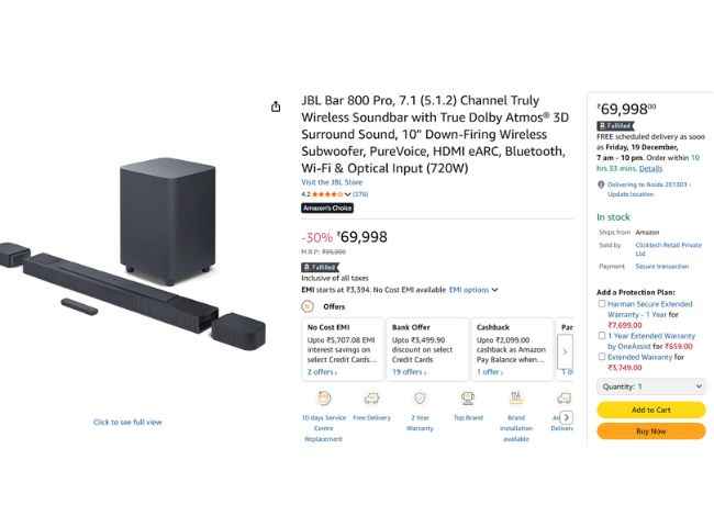 இந்த JBL Bar 800 Pro 7.1ch ஹோம் தியேட்டர் சிஸ்டம் டால்பி அட்மாஸ் சவுண்ட் மற்றும் வைஃபை கனெக்ஷன் போன்ற பிரீமியம் அம்சங்களால் நிறைந்துள்ளது. வயர்களின் எந்த குழப்பத்தையும் குறைக்க உண்மையிலேயே வயர்லெஸ் அமைப்பைக் கொண்ட சரவுண்ட் சவுண்ட் பர்போமான்ஸ் இது வழங்குகிறது, இந்த ஹோம் தியேட்டர் சிஸ்டம் சப்வூஃபர் கொண்ட சவுண்ட்பார் மற்றும் ரூமில் எங்கும் வைக்கக்கூடிய இரண்டு பிரிக்கக்கூடிய பின்புற ஸ்பீக்கர்களுடன் வருகிறது. இதன் 10-இன்ச் வயர்லெஸ் சப்வூஃபர் தாக்கத்திற்கான டவுன்-ஃபயரிங் வெளியீட்டைக் கொண்டுள்ளது, மேலும் அறையை நிரப்பும் பாஸ் பர்போமான்ஸ் உருவாக்குகிறது. உண்மையான 3D சரவுண்ட் சவுண்ட் எஃபெக்ட்டுக்கு, இந்த JBL ஹோம் தியேட்டர் சவுண்ட்பாரில் 2-அப் ஃபயரிங் டிரைவர்களுடன் Dolby Atmos சப்போர்டுடன் வருகிறது. அதிக சவுண்ட் கூட பாஸ் சுத்தமாக இருக்கும், எனவே நீங்கள் திரைப்படங்கள், ம்யுசிக் , கேமிங் மற்றும் பலவற்றை அனுபவிக்க முடியும் இதை பேங்க் ஆபரின் கீழ் இதை வெறும் ரூ,66,499 யில் வாங்க முடியும்