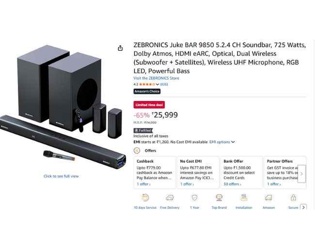இந்த Zebronics 5.2.4 சேனல் ஹோம் தியேட்டர் சக்திவாய்ந்த பேஸ் பர்போமன்சுக்கு ஏற்றது. இதில் இரட்டை வயர்லெஸ் சப் வூஃபர்கள் கொண்ட சவுண்ட்பார் மற்றும் சரவுண்ட் சவுண்ட் அனுபவத்திற்காக சேட்லைட் ஸ்பீக்கர்கள் உள்ளன. Dolby Atmos சப்போர்டுடன் பொருத்தப்பட்ட இந்த ஹோம் தியேட்டர் பல்வேறு வால்யூம் நிலைகளில் ஹை ஆடியோ தெளிவை வழங்குகிறது. இது அதன் 16.51cm இரட்டை வயர்லெஸ் சப் வூஃபர்கள் மூலம் 110W அவுட்புட் வழங்கும் ஒரு தும்பிங் பேஸ் செயல்திறனை வழங்குகிறது, எனவே நீங்கள் அதிரடி காட்சிகள், கேமிங், இசை மற்றும் பலவற்றை அனுபவிக்க முடியும். இது AUX, USB, ஆப்டிகல் மற்றும் eARC மூலம் எளிதான கனெக்ஷன் விருப்பங்களை வழங்குகிறது மற்றும் வயர்லெஸ் டிவைஸ் கனெக்ஷனுக்காக புளூடூத் v5.3 ஐ சப்போர்ட் செய்கிறது. எஊம் சர்வுண்டிங் RGB LED விளக்குகளை வழங்கும் இ-காமர்ஸ் தளமான அமேசானில் இதை வேரும்றூ,24,499ரூபாயில் வாங்கலாம்.