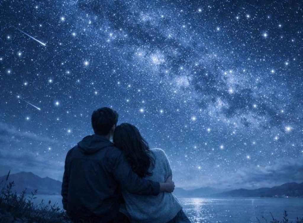 விண்மீன் நிறைந்த இரவு, ஜோடி ஒன்றாக வானத்தை பார்க்கும் காட்சி, மென்மையான நீல நிற டோன்