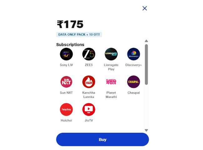 ஜியோவின் ரூ,175 யில் திட்டத்தை பற்றி பேசினால் JioTV PREMIUM திட்டத்தின் கீழ் வருகிறது இந்த திட்டத்தின் நன்மை என பேசினால் 28 நாட்கள் வேலிடிட்டி உடன் இதனுடன் இதில் 10 GB டேட்டா வழங்கப்படுகிறது மேலும் இது வெறும் டேட்டா திட்டமாகும் Sony LIV, ZEE5, Liongate Play, Discovery+, Sun NXT, Kanchha Lannka, Planet Marathi, Chaupal and Hoichoi via JioTV Mobile App.போன்ற வெறும் 10 ஆப்கள் மட்டுமே வழங்குகிறது மேலும் இதன் ஸ்பீட் குறையும்போது 64 Kbps ஆக குறைக்கப்படுகிறது.