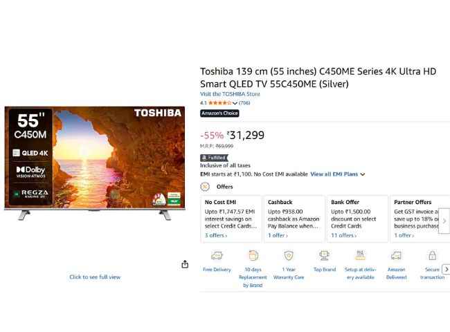 Toshiba யின் இந்த டிவி 55-இன்ச் TV அமேசானில் ரூ,31,299க்கு லிஸ்ட்டிங் செய்யப்பட்டுள்ளது, ஆனால் பேங்க் ஆபரின் கீழ் ரூ,1500 டிஸ்கவுண்ட் வழங்கப்படுகிறது அதன் பிறகு இந்த இந்த டிவியை வெறும் ரூ,29,799 யில் வாங்கலாம் இதை தவிர பழைய டிவியை எக்ஸ்சேஞ் செய்வதன் மூலம் மிக சிறந்த டிஸ்கவுண்ட் பெறலாம், இந்த டிவியின் அம்சங்கள் பற்றி பேசினால் Toshiba யின் 55-இன்ச் TV 4K Ultra HD (3840 x 2160) ரேசளுசன்கொண்ட QLED TV மற்றும் மிக சிறந்த சவுண்ட் எபக்ட்க்கு Dobly Atoms சப்போர்ட் வழங்கப்படுகிறது.