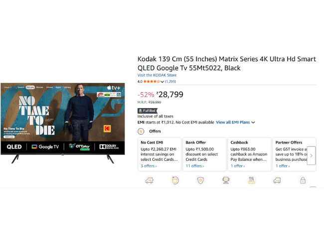 Kodak யின் 55-இன்ச் கொண்ட TV அமேசானில் ரூ,28,799க்கு லிஸ்ட்டிங் செய்யப்படுகிறது,ஆனால் பேங்க் ஆபரின் கீழ் ரூ,1500க்கு லிஸ்ட்டிங் செய்யப்படுகிறது அதன் பிறகு இந்த டிவியை ரூ,27,299க்கு வாங்கலாம் இதை தவிர நோ கோஸ்ட் EMI மற்றும் எக்ஸ்சேஞ் ஆபரின் கீழ் சிறப்பு நன்மையை பெறலாம் இந்த டிவியின் அம்சங்கள் பற்றி பேசினால் Kodak 55-இன்ச் Matrix Series 4K Ultra Hd ஸ்மார்ட் QLED 3840 x 2160) ரெசளுசன் உடன் மிக சிறந்த சவுண்ட்க்கு Dolby Atmos சப்போர்ட் செய்யப்படுகிறது