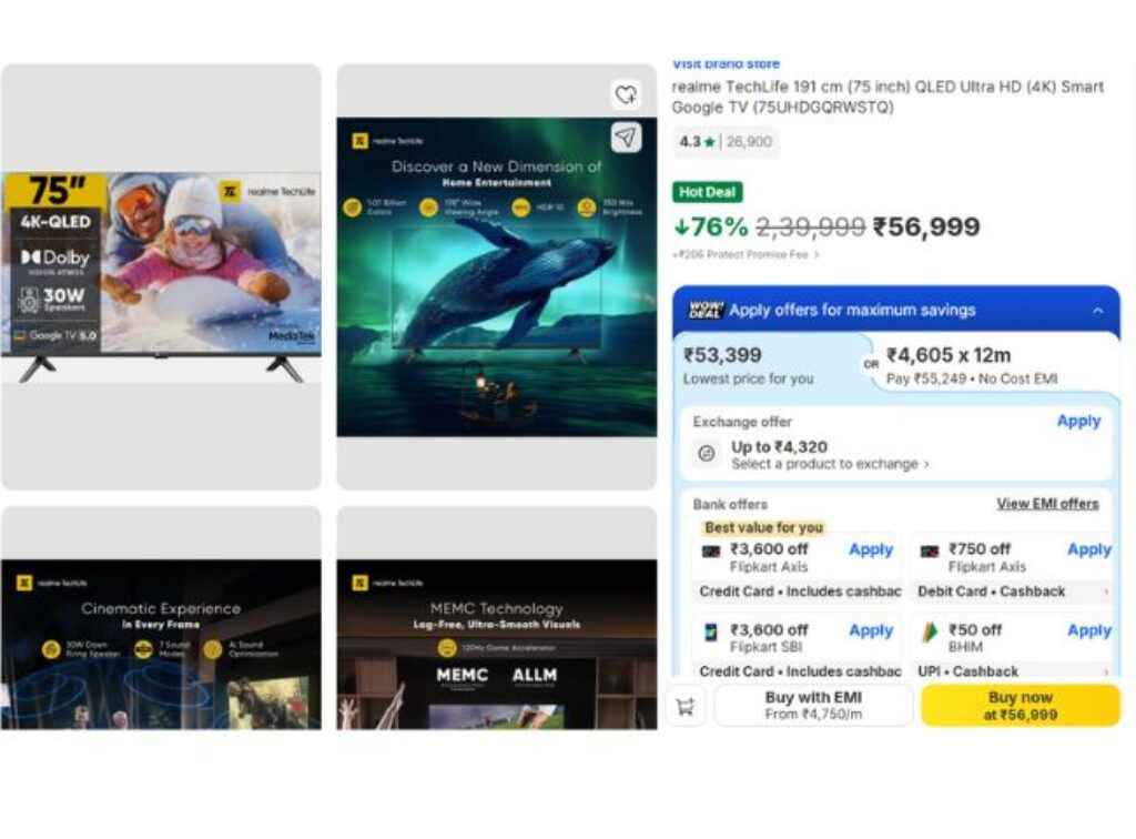 realme TechLife யின் 75இன்ச் சைஸ் டிவி பிளிப்கார்டில் ரூ,56,999க்கு லிஸ்ட்டிங் செய்யப்பட்டுள்ளது, ஆனால் பேங்க் ஆபரின் கீழ் இந்த டிவியில் ரூ,3600 டிஸ்கவுண்ட் வழங்கப்படுகிறது அதன் பிறகு இந்த டிவியை வெறும் ரூ,53,399க்கு வாங்கலாம், இதை தவிர நோ கோஸ்ட் EMI மற்றும் பழைய டிவியை எக்ஸ்சேஞ் செய்து இன்னும் குறைந்த விலையில் வாங்கலாம் இதை தவிர இந்த டிவியின் அம்சங்கள் பற்றி பேசினால், realme TechLife (75 inch) QLED Ultra HD (4K) Smart அம்சங்களுடன் இது 60 Hz ரெப்ரஸ் ரெட்டுடன் வருகிறது மேலும் இந்த டிவியில் மிக சிறந்த சவுண்ட்க்கு Dolby Vision மற்றும் Dolby Atmos சப்போர்ட் வழங்குகிறது.