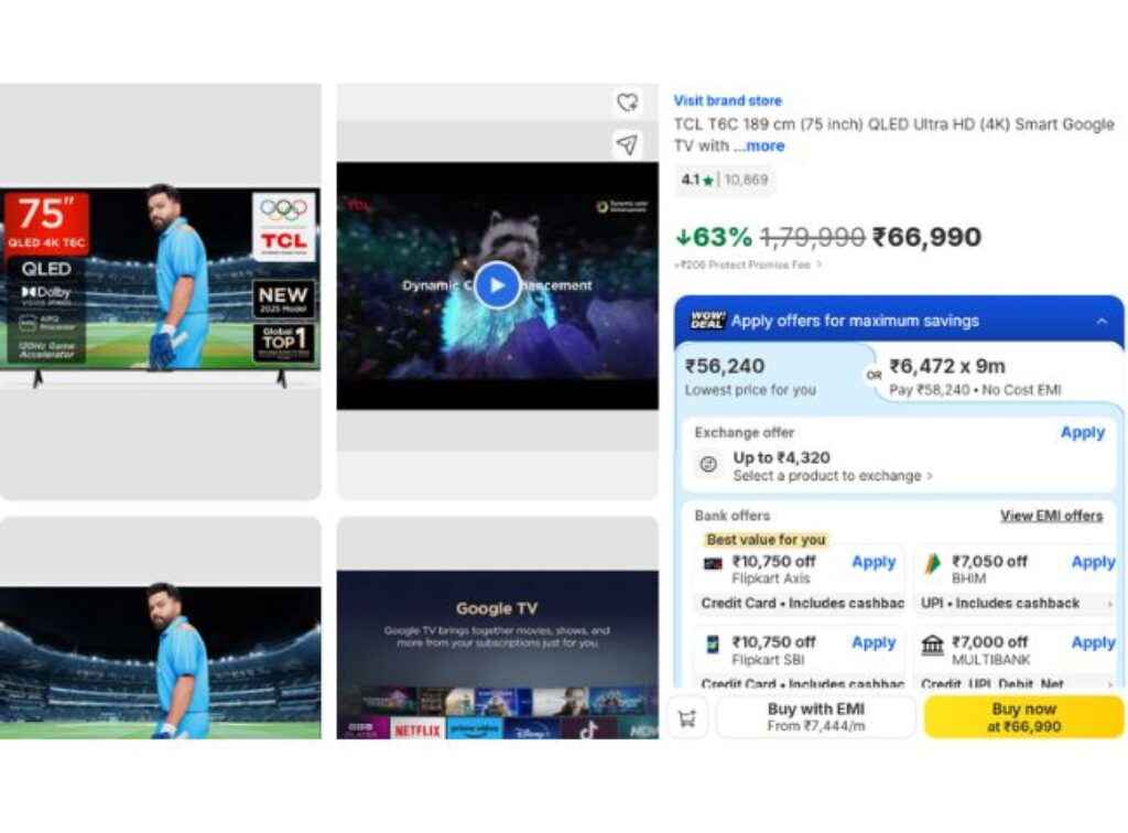 TCL யின் இந்த டிவி பிளிப்கார்டில் ரூ,66,990க்கு லிஸ்ட்டிங் செய்யப்பட்டுள்ளது ஆனால் பேங்க் ஆபரின் கீழ் இந்த டிவியில் ரூ,10,750 டிஸ்கவுண்ட் வழங்கப்படுகிறது, அதன் பிறகு இந்த டிவியை வெறும் ரூ,56,240 யில் வாங்கலாம் இந்த டிவியின் ஒரிஜினல் MRP விலையோ ரூ,1,79,990 ஆகும் ஆனால் அதிலிருந்து மிக சிறந்த டிஸ்கவுண்ட்டின் கீழ் 1,23,750 டிஸ்கவுண்ட் வழங்கப்படுகிறது, இந்த டிவியின் அம்சங்கள் பற்றி பேசினால், (75 inch) QLED Ultra HD (4K) ஸ்மார்ட் டிவி Dolby Vision- Atmos சப்போர்டுடன் மிக சிறந்த சவுண்ட் குவாலிட்டி வழங்கும்