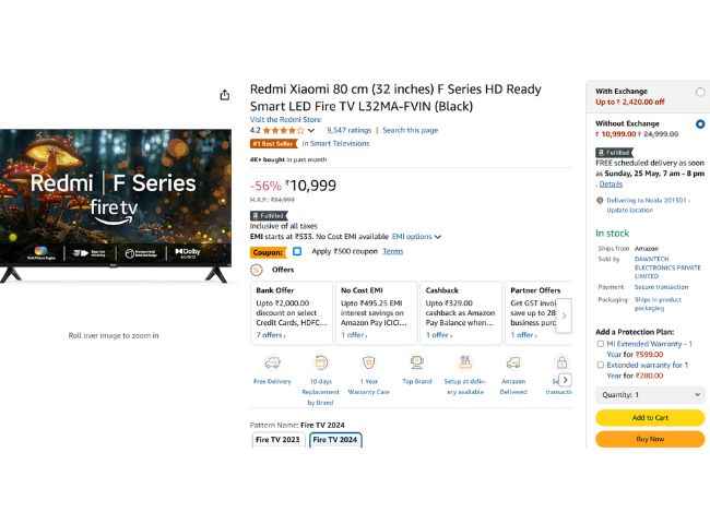 Redmi யின் இந்த டிவி அமேசானில் ரூ,10,999க்கு லிஸ்ட்டிங் செய்யப்பட்டுள்ளது ஆனால் இதில் கூப்பன் ஆபர் நன்மையாக ரூ,500 மற்றும் பேங்க் ஆபராக ரூ,2000 வழங்கப்படுகிறது அதன் பிறகு இதை வெறும் ரூ,8,499க்கு வாங்கலாம் மேலும் இதை Amazon Pay ICICI கிரெடிட் கார்டிலிருந்து வாங்கினால் கேஷ்பேக் நன்மை பெறலாம் இதை தவிர பழைய டிவியை எக்ஸ்சேஞ் செவதன் மூலம் டிஸ்கவுண்ட் நன்மையும் பெறலாம்.