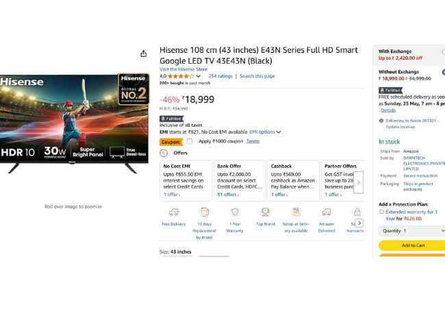 Hisense யின் இந்த 43 இன்ச் கொண்ட டிவி ரூ,18,999க்கு லிஸ்ட்டிங் செய்யப்பட்டுள்ளது, மேலும் கூப்பன் ஆபராக ரூ,1000 டிஸ்கவுண்ட் மற்றும் பேங்க் ஆபராக ரூ,2000 டிஸ்கவுண்ட் நன்மை வழங்கப்படுகிறது ஆபருக்கு பிறகு ரூ,15999 யில் வாங்கலாம் மேலும் நீங்கள் amazon pay ICICI கிரெடிட் கார்ட் மூலம் வாங்கினால் கேஷ்பேக் நன்மை மற்றும் எக்ஸ்சேஞ் ஆபரின் கீழ் இன்னும் குறைந்த விலையில் வாங்கலாம்.