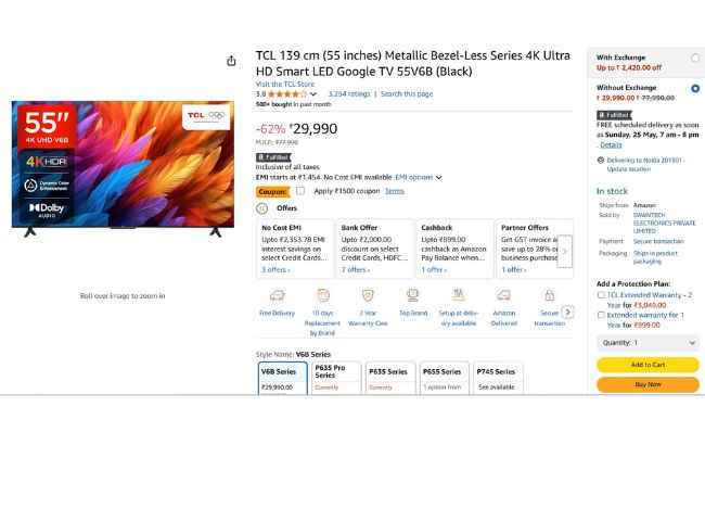 TCL யின் 55 இன்ச் கொண்ட டிவியின் விலை ரூ,29,990க்கு லிஸ்ட்டிங் செய்யப்பட்டுள்ளது, ஆனால் பேங்க் ஆபரின் கீழ் ரூ,1500 டிஸ்கவுண்ட் மற்றும் பேங்க் ஆபரின் கீழ் ரூ,2000 டிஸ்கவுண்ட் வழங்கப்படுகிறது அதன் பிறகு இதை வெறும் ரூ,26,499க்கு வாங்கலாம் மேலும் நீங்கள் amazon pay ICICI கிரெடிட் கார்ட் மூலம் வாங்கினால் கேஷ்பேக் நன்மை மற்றும் எக்ஸ்சேஞ் ஆபர் நன்மையும் பெறலாம்.