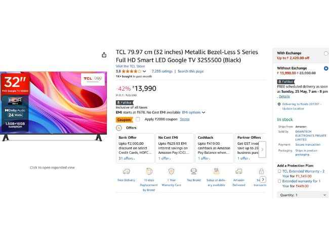 TCL யின் இந்த 32 இன்ச் கொண்ட டிவி ரூ,13,990க்கு லிஸ்ட்டிங் செய்யப்பட்டுள்ளது ஆனால் இதில் ரூ,2000 கூப்பன் டிஸ்கவுண்ட் மற்றும் பேங்க் டிஸ்கவுண்ட் ஆபரக ரூ,2000 டிஸ்கவுண்ட் வழங்கப்படுகிறது ஆகமொத்தத் ரூ,4000டிஸ்கவுண்ட் வழங்கப்படுகிறது அதன் பிறகு இதை வெறும் ரூ,9,999 யில் வாங்கலாம் மேலும் இதில் amazon pay ICICI கிரெடிட் கார்ட் மூலம் வாங்கினால் கேஷ்பேக் நன்மை என pa பெறலாம்.