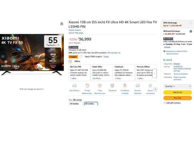 Xiaomi யின் இந்த 55-இன்ச் கொண்ட டிவி ரூ,₹36,999க்கு லிஸ்ட்டிங் செய்யப்பட்டுள்ளது, ஆனால் பேங்க் ஆபரின் கீழ் ரூ,2000 மற்றும் கூப்பன் டிஸ்கவுண்ட் நன்மையாக ரூ,500 வழங்கப்படுகிறது அதன் பிறகு இதை வெறும் ரூ,34,499க்கு வாங்கலாம் இதை தவிர இந்த டிவியை amazon pay கேஷ்பேக் போன்ற பல நன்மை பெறலாம் இதனுடன் இந்த டிவி சமிபத்தில் அறிமுகம் செய்யப்பட்ட மாடல் ஆகும்