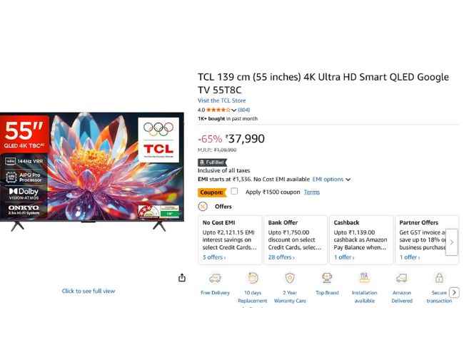 TCL யின் இந்த 55-இன்ச் கொண்ட டிவி அமேசானில் ரூ,37,990க்கு லிஸ்ட்டிங் செய்யப்பட்டுள்ளது, ஆனால் இதில் ரூ, 1500 கூப்பன் ஆபரும் மற்றும் ரூ,1750 பேங்க் ஆபர் உடன் இந்த டிவியில் ஆக மொத்தம் ரூ,3,250 டிஸ்கவுண்ட் வழங்கப்படுகிறது அதன் பிறகு இந்த டிவியை வெறும் ரூ,34,740 யில் வாங்கலாம் இதை தவிர நோ கோஸ்ட் EMI மற்றும் பழைய டிவியை கொடுத்து எக்ஸ்சேஞ் ஆபரின் கீழ் மிக சிறந்த நன்மை பெறலாம்.இதன் அம்சங்களை பற்றி பேசினால், TCL 55-இன்ச் கொண்ட 4K Ultra HD Smart QLED (3840 x 2160) ரேசளுசன் இதனுடன இந்த டிவியில் மிக சிறந்த சவுண்ட்க்கு Dolby Atmos சப்போர்ட் வழங்கப்படுகிறது