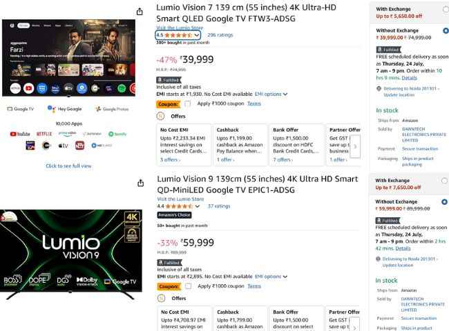 Lumio Vision 7 யின் 55-இன்ச் சைஸ் கொண்ட இந்த டிவியின் விலை அமேசானில் ரூ,39,999க்கு லிஸ்ட்டிங் செய்யப்பட்டுள்ளது ஆனால் இதில் கூப்பன் ஆபராக ரூ,1000 மற்றும் பேங்க் ஆபரின் கீழ் ரூ,1500 டிஸ்கவுண்ட் வழங்கப்படுகிறது ஆகமொத்தம் இதை வெறும் ரூ,37,499க்கு வாங்கலாம் இதை தவிர இந்த டிவியை நோ கோஸ்ட் EMI மற்றும் பழைய டிவியை கொடுத்து எக்ஸ்சேஞ் ஆபரின் கீழ் இன்னும் குறைந்த விலையில் வாங்கலாம்.