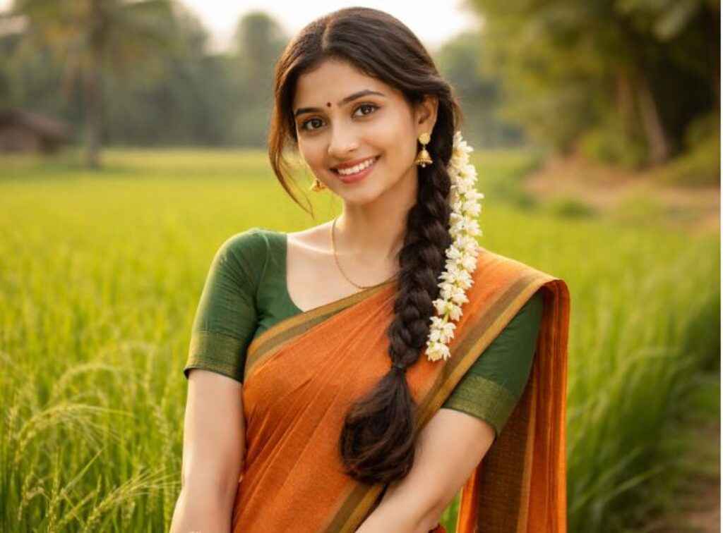 ஒரு தென்னிந்திய பெண் எளிமையான பருத்தி சேலை அணிந்து, நெல் வயல் அல்லது கிராம சூழல் பின்னணி, இயற்கை வெளிச்சம், சிரித்த முகம், இயல்பான தோற்றம், நெருக்கமான மற்றும் உண்மை உணர்வு.