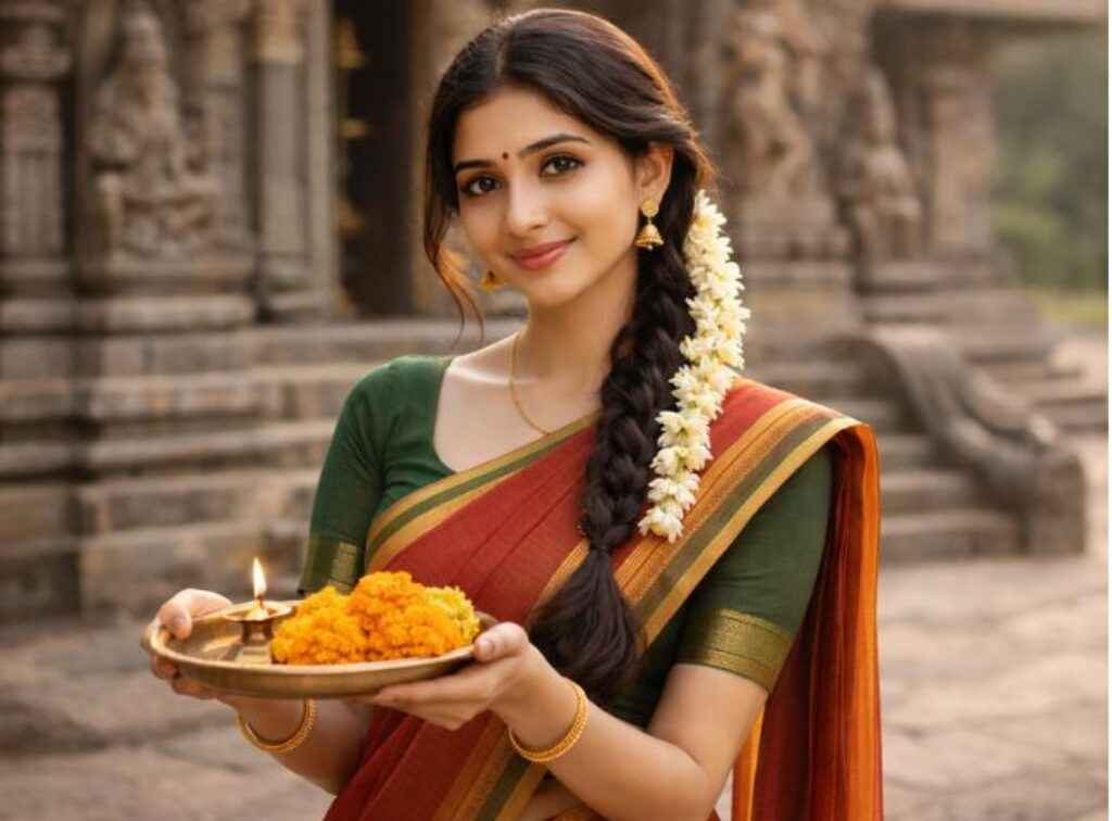 ஒரு தென்னிந்திய பெண் பாரம்பரிய சேலை அணிந்து, கோவில் பின்னணி, கையில் பூஜை தட்டு, மல்லிகைப்பூ ஜடை, மென்மையான வெளிச்சம், ஆன்மீகமான மற்றும் அமைதியான உணர்வு.