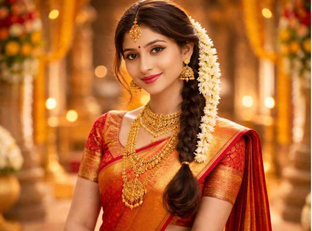 ஒரு தென்னிந்திய மணப்பெண், சிவப்பு அல்லது மஞ்சள் காஞ்சிபுரம் சேலை, தங்க நகைகள், ஜடையில் மல்லிகைப்பூ, முழு மேக்கப், ஆலங்கட்டி ஒளி, கோவில் அல்லது திருமண மண்டபம் பின்னணி, பிரகாசமான மற்றும் செம்மையான லுக்.